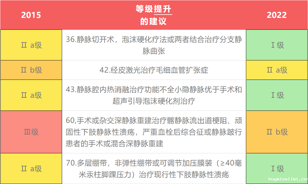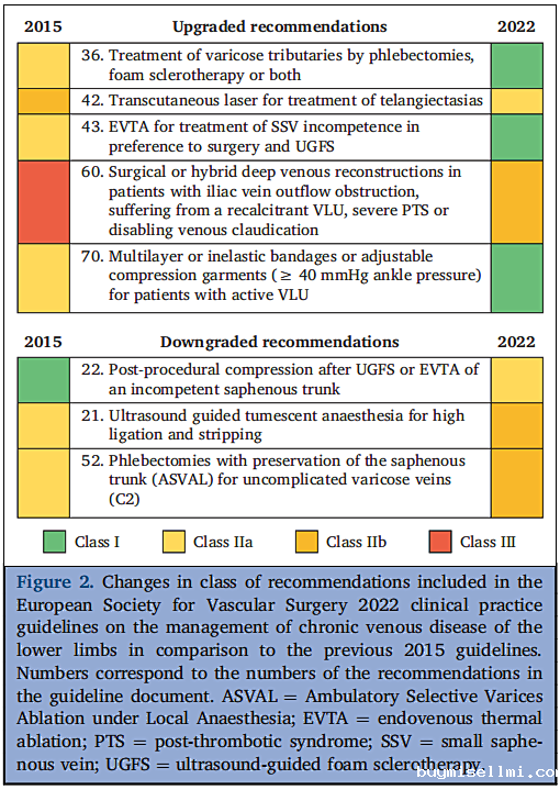 以上表格与2015年的指南相比,欧洲血管外科学会2022年关于下肢慢性静脉疾病管理的临床实践指南中包含的推荐分类的变化。ASVAL为局 麻下选择性点式静脉曲张消融术;EVTA为静脉腔内热消融;PTS为血栓形成后综合征;SSV为小隐静脉;UGFS为超声引导下泡沫硬化剂治疗。
